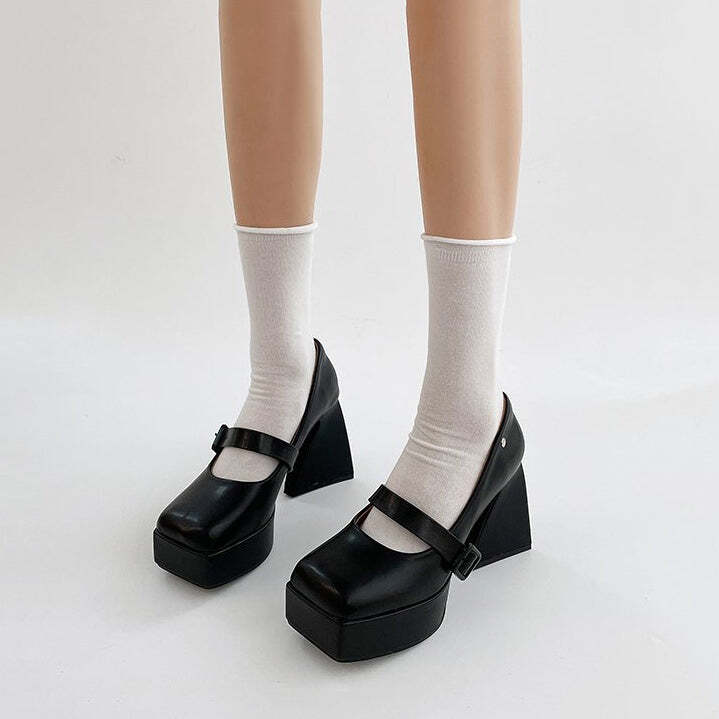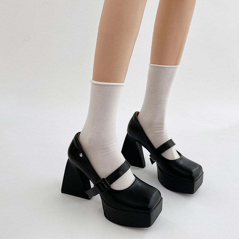 These Mary Jane heels are made from vegan leather and feature chunky, block heels and a buckle closure