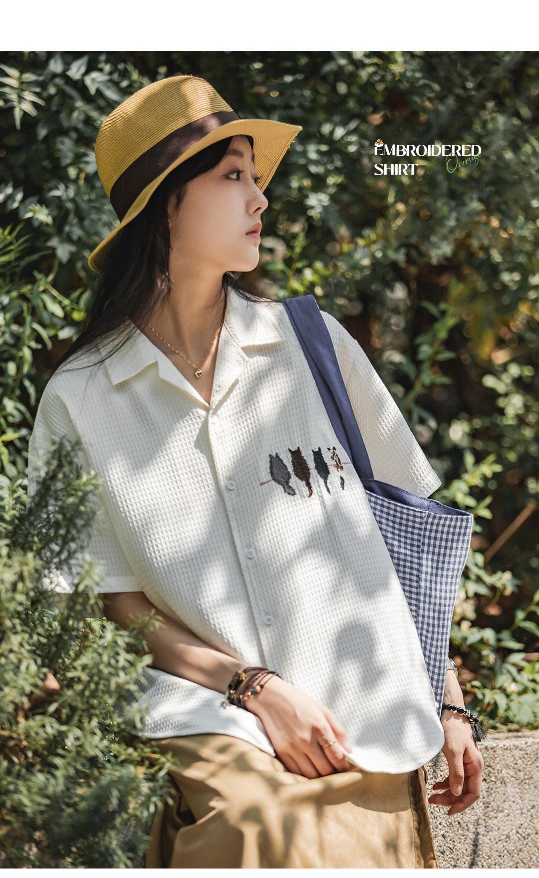 Our Cat Embroidered Shirt adds a touch of whimsy to your summer ensemble. This piece, sporting adorable cat figures, is crafted from a comfortable cotton-polyester blend. Its short sleeves and classic collar balance charm and sophistication, resonating with feline aficionados.