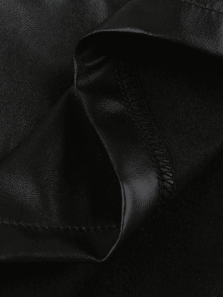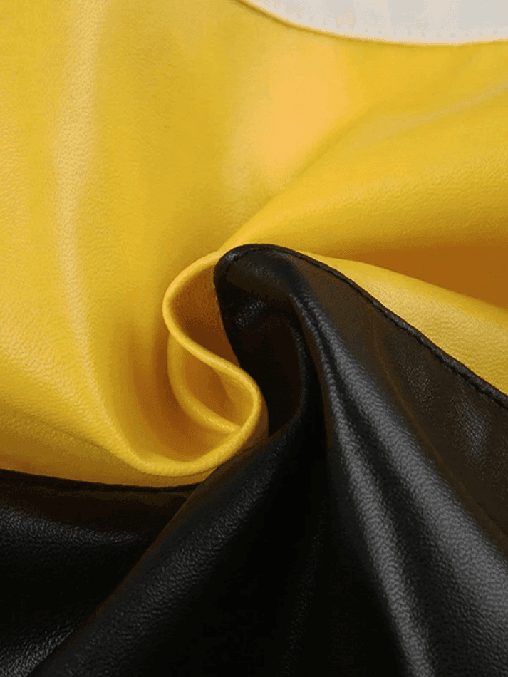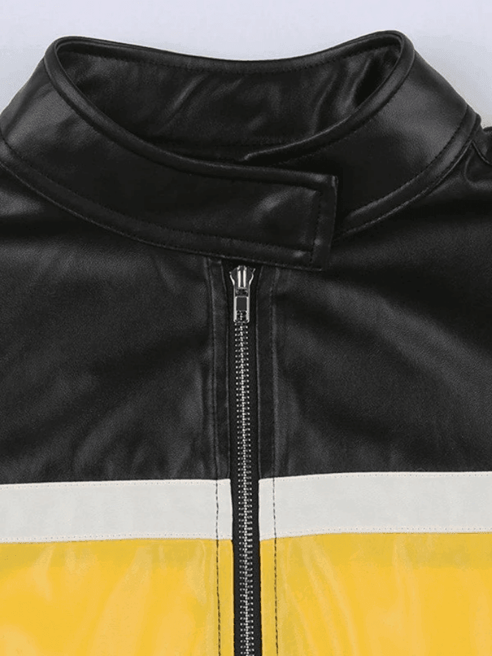 Description: Fall in love with this trendy Color Block Moto Jacket. Made with faux leather, it features contrast color block panels, a snap button fasten on the collar, and a zip fly design. Perfect for autumn-winter season.