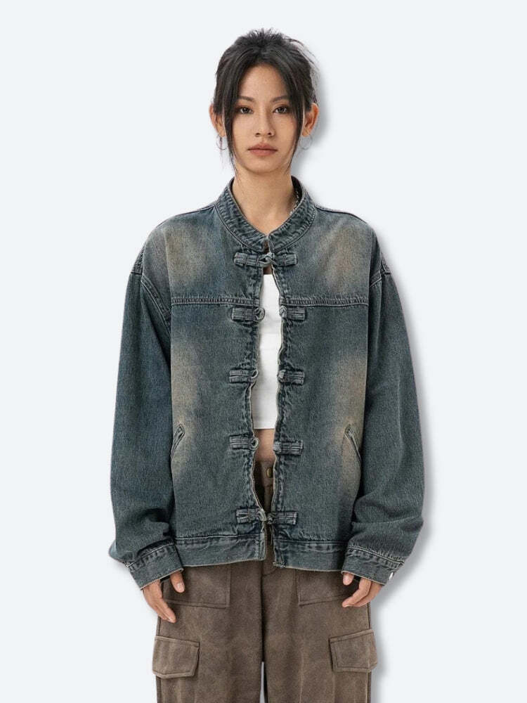 The Distressed Denim Jacket blends classic denim with traditional frog button closures for a unique twist. Its washed finish offers a vintage vibe, while the mandarin collar adds sophistication. Perfect with cargo pants for streetwear or jeans for a casual, coordinated look.