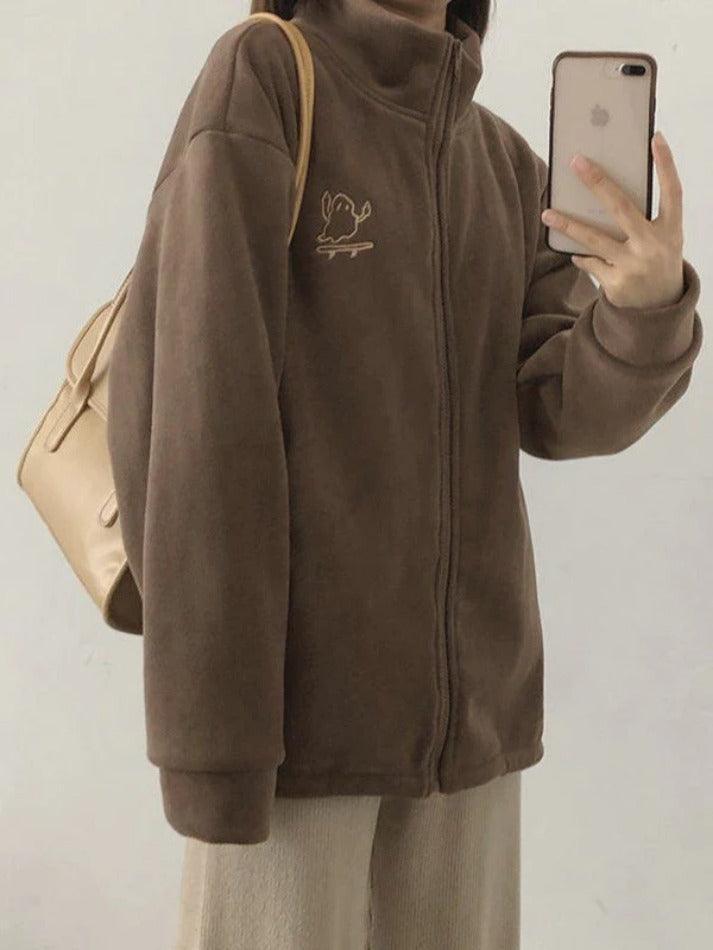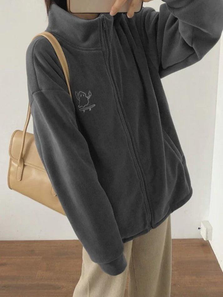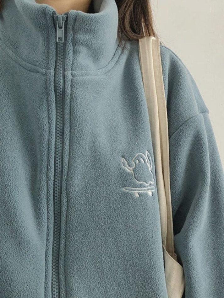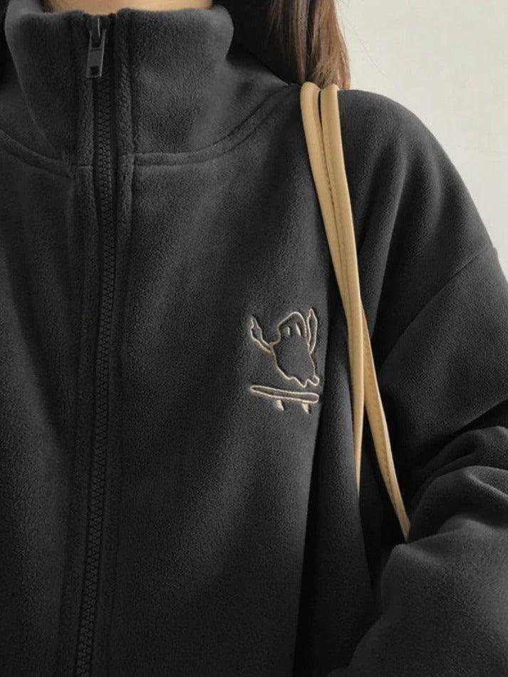Description: Elevate your outfit with our cozy Embroidered Zip Up Fleece Jacket. Perfect for chilly days and nights, this versatile piece boasts a longline silhouette, a cute cartoon embroidery on the front chest, drop shoulders for added flair, and a convenient zip closure. Stay warm and stylish effortlessly.