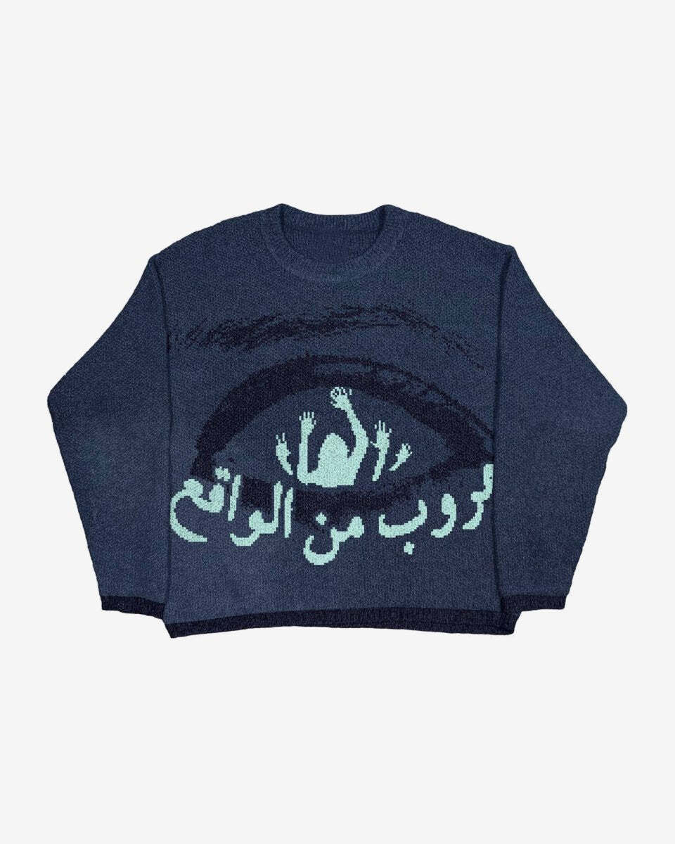 The ‘Escape Knit – 3ARB Edition’ is a visual protest. With a haunting eye graphic and Arabic typography reading “escape from reality”, this sweater blurs the line between personal expression and collective resistance. It speaks for those who feel watched, trapped, or emotionally detached in a digital age.