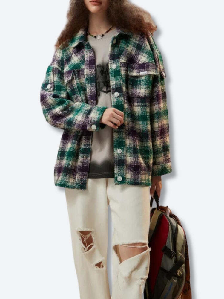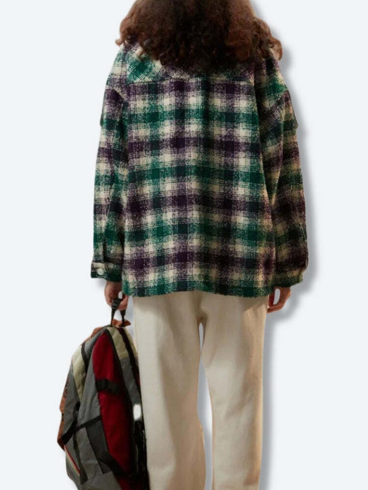 The Flannel Shirt Jacket combines comfort and warmth with a bold green and purple plaid pattern. Its soft fabric makes it perfect for layering over a t-shirt or hoodie, offering a cozy yet stylish look for casual outings.