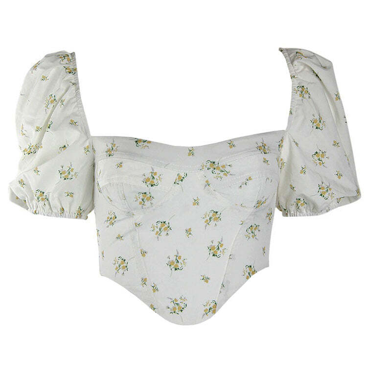 This corset top has puff sleeves, underwire bust support and a floral print all over 💮