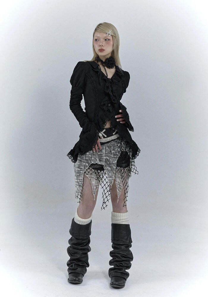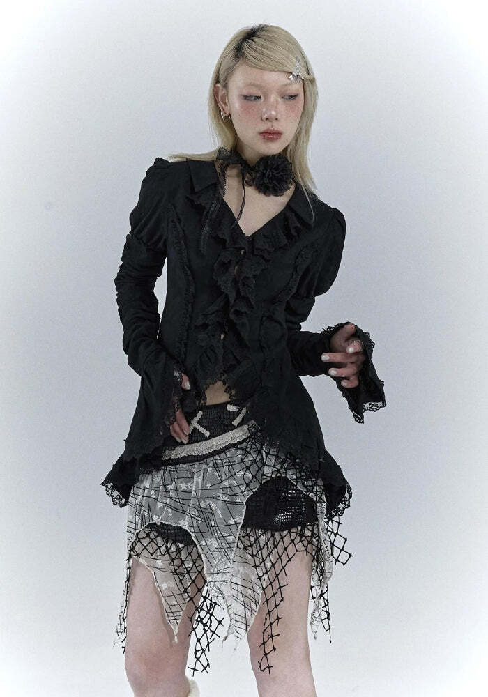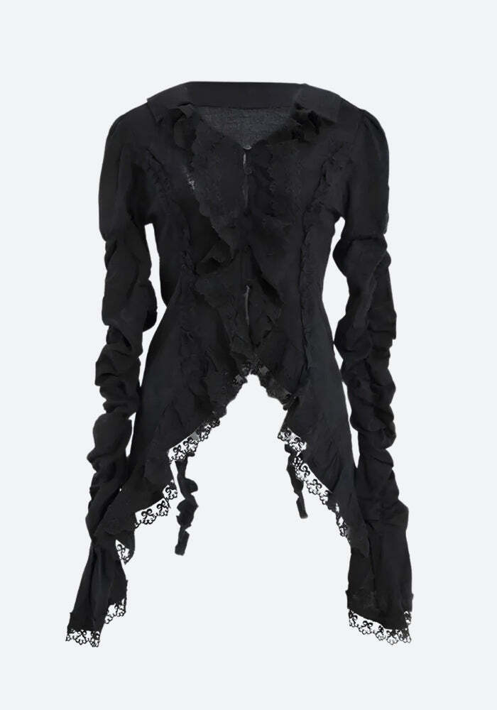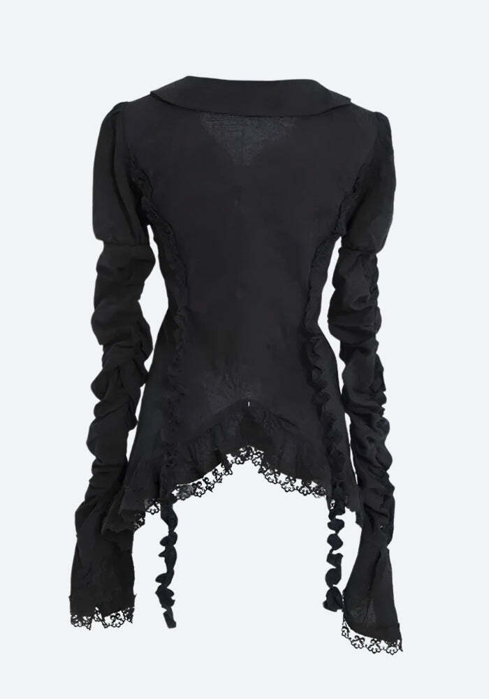 Venture into the shadows with the Goth Asymmetric Ruched Sleeve Shirt. This creation blends the enigmatic allure of goth culture with intricate ruffles, sophisticated button closures, and ethereal lace adornments. Its dramatic flare cuffs and plunging V-neck carve out a niche in any avant-garde wardrobe, perfect for those who court the night in style.