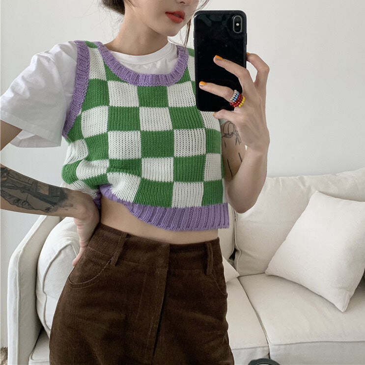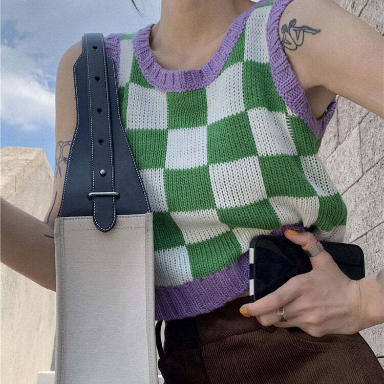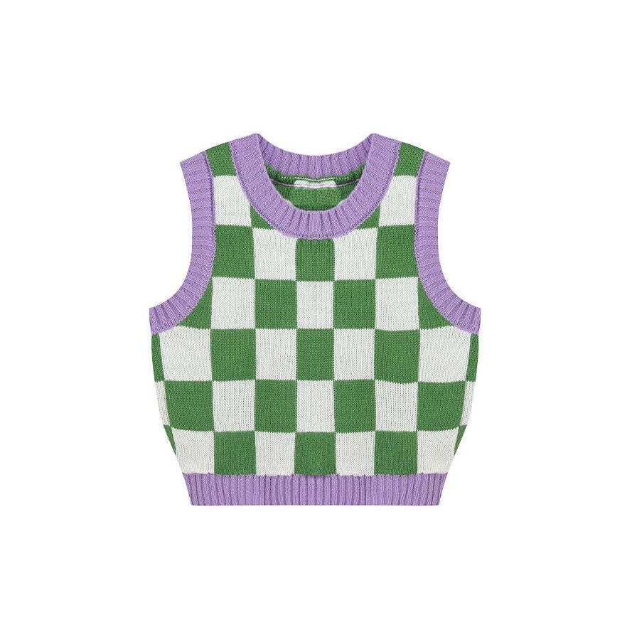 This knit sweater vest has ribbed trim and an green & purple checkered print all overĀ š