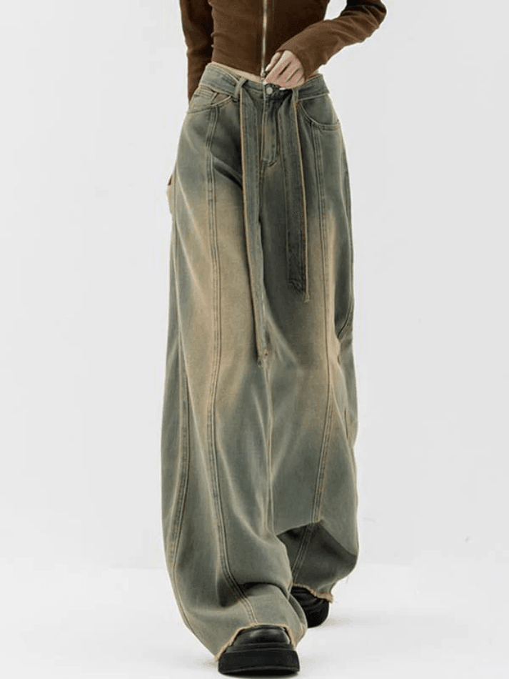 ‘Le Jean boyfriend avec bretelles à nouer et coutures de chez Mauv Studio Y2K Store