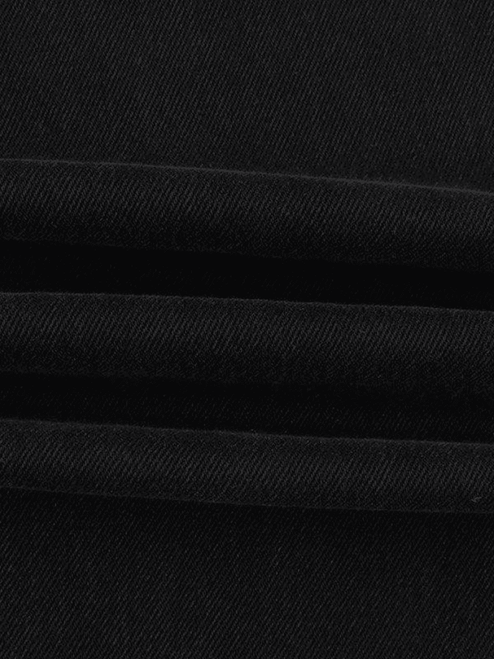 Description: Ce jean en denim vintage délavé foncé a une coupe droite, avec des rayures blanchies sur les deux côtés, des passants de ceinture multiples, des poches fonctionnelles et une fermeture à glissière à bouton.