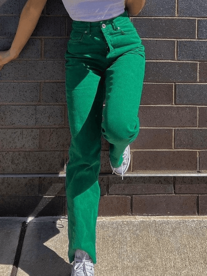Description : Assis à une taille flatteuse, ce jean à la silhouette décontractée, dispose de 5 poches, de plusieurs passants de ceinture et d’une fermeture à bouton zip. ‘Le Jean boyfriend vintage délavé vert de chez Mauv Studio Y2K Store
