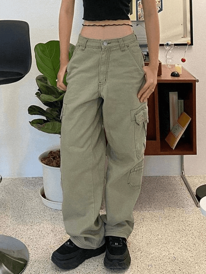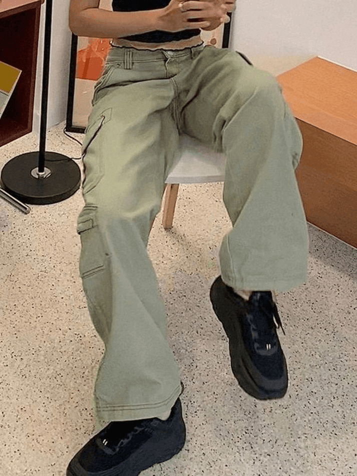 Design : ce jean délavé vintage est doté d’une coupe décontractée, avec des poches cargo plaquées et une fermeture zippée à bouton. ‘Le Jean cargo vert délavé avec poche de chez Mauv Studio Y2K Store