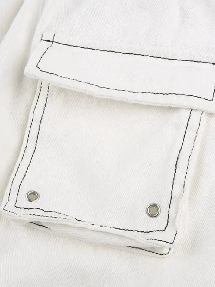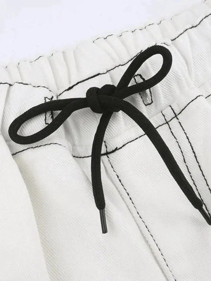 Description : Lorsque l’ambiance rétro et sportive rencontre un jean cargo élégant, ce doit être une option parfaite. Coupes à une silhouette flatteuse, il a un style de cordon de serrage réglable à la taille, des rayures latérales et des poches cargo plaquées des deux côtés, finies avec des détails de surpiqûres contrastées sur la jambe.