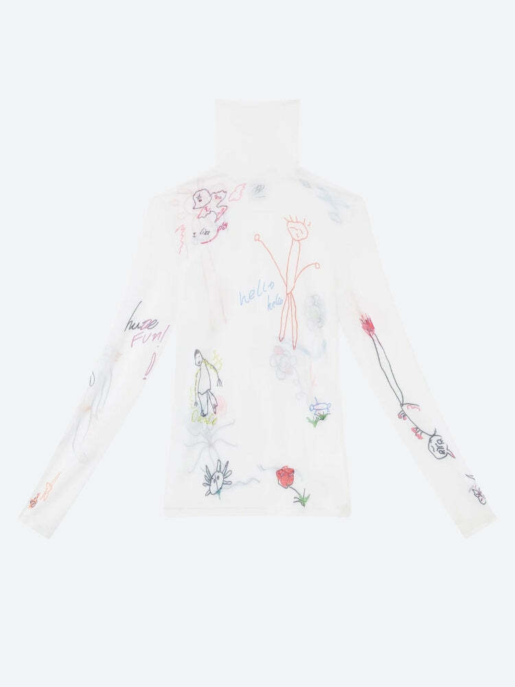 Channel playful vibes with this unique top, which beautifully showcases whimsical doodles reminiscent of a child’s sketchbook. The sheer fabric adds a contemporary edge, while the colorful drawings bring a sense of joy. This top is perfect for those looking to express their creative side. Pair it with casual jeans for a laid-back look.