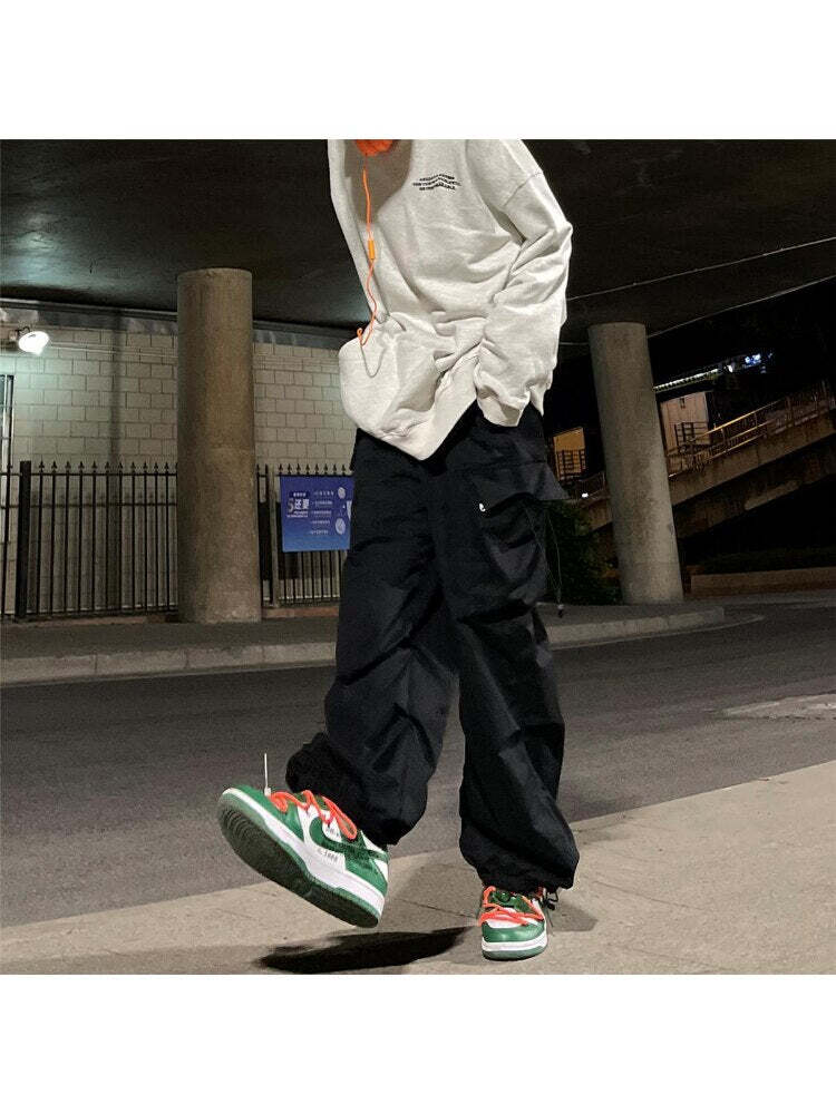 Pantalon Cargo Parachute Baggy style Vintage Y2K. Cette pièce sera idéale pour apporter une touche de nouveauté et de fraîcheur à ton look tendance et fashion. La collection de pantalon cargo streetwear s’inspire d’une vision de la mode urbaine et streetwear.