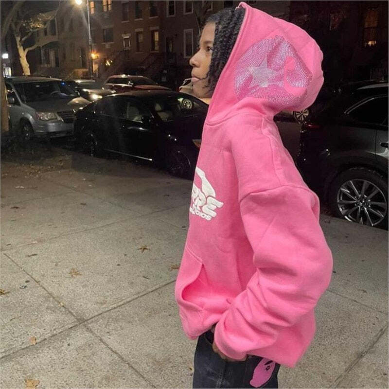 Le pink full zip hoodie Y2K orné de Strass est le hoodie idéal pour un look streetwear fashion. Ce hoodie à fermeture éclair rose intense est parfait pour des occasions spéciales et offre une touche de glamour unique. Avec des strass scintillants sur le devant, ce hoodie est certain de briller et se démarquer. Fabriqué à partir de matériaux doux et respirant, ce hoodie à fermeture éclair est aussi confortable que beau. Faites-vous remarquer et portez ce hoodie rose cool avec fierté.