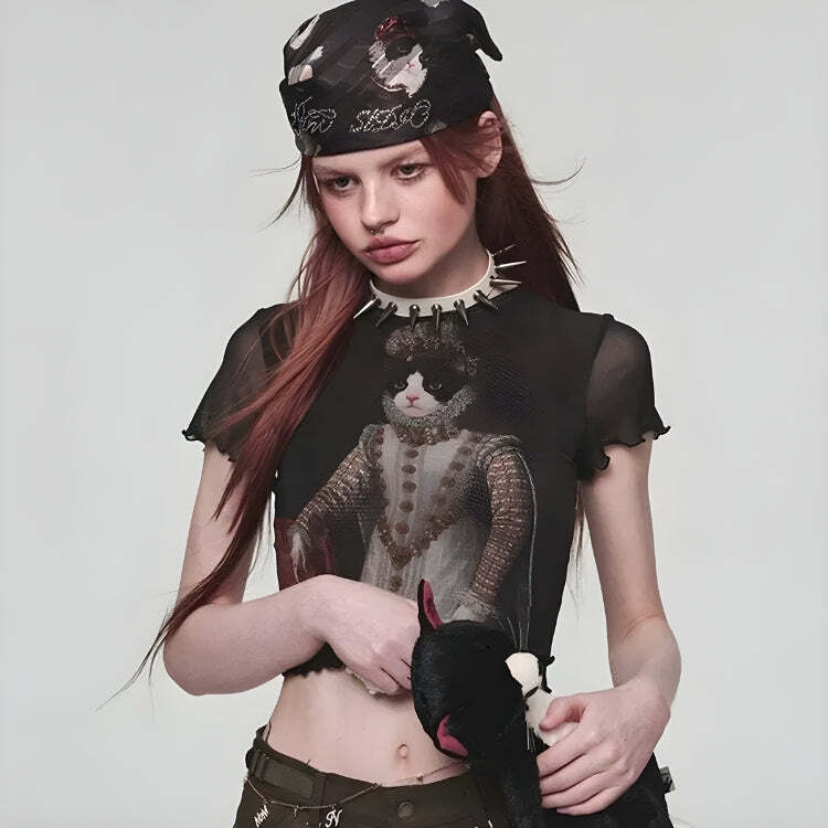 This playful crop top features a charming cat princess print on the front, set against a backdrop of lightweight mesh material. Perfect for those who enjoy streetwear with a touch of humor, it’s ideal for summer days or adding a fun twist to your outfit.