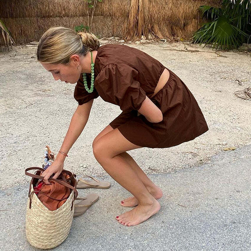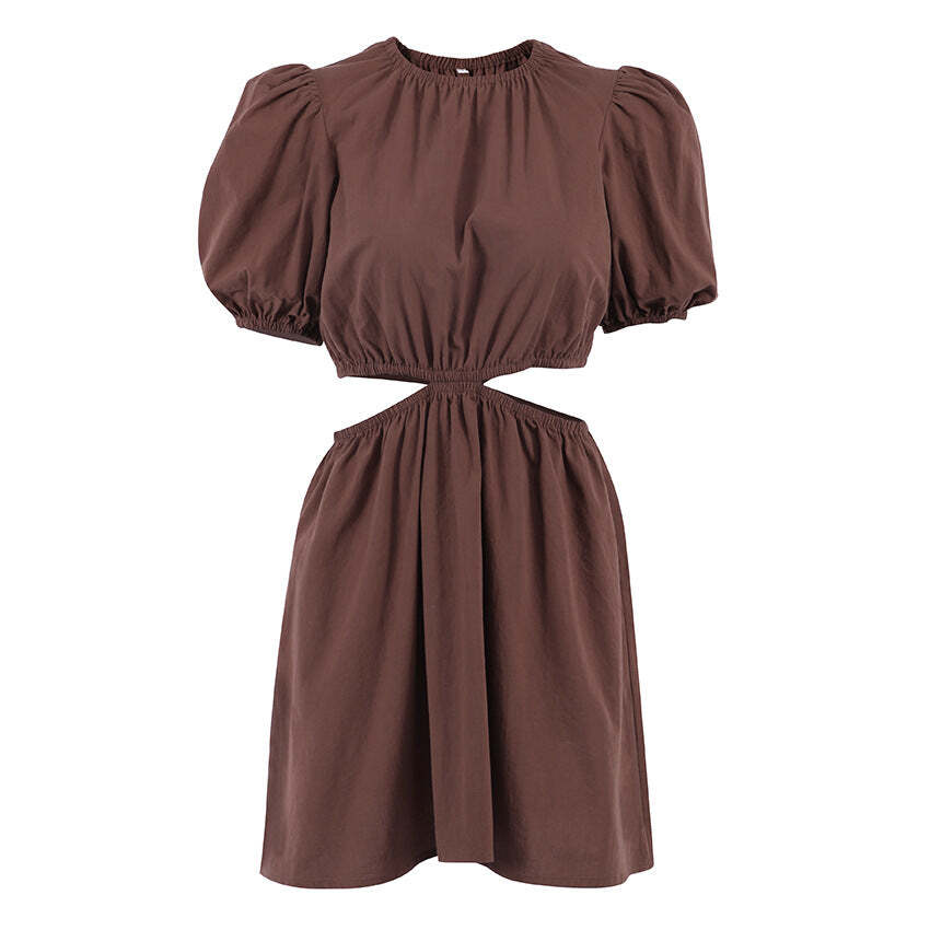 Sans effort et de conception classique, la mini-robe Loudya présente une belle encolure haute, des manches bouffantes élastiquées et une découpe flatteuse à la taille. Teint à la main dans une popeline de coton uni chocolat noir.