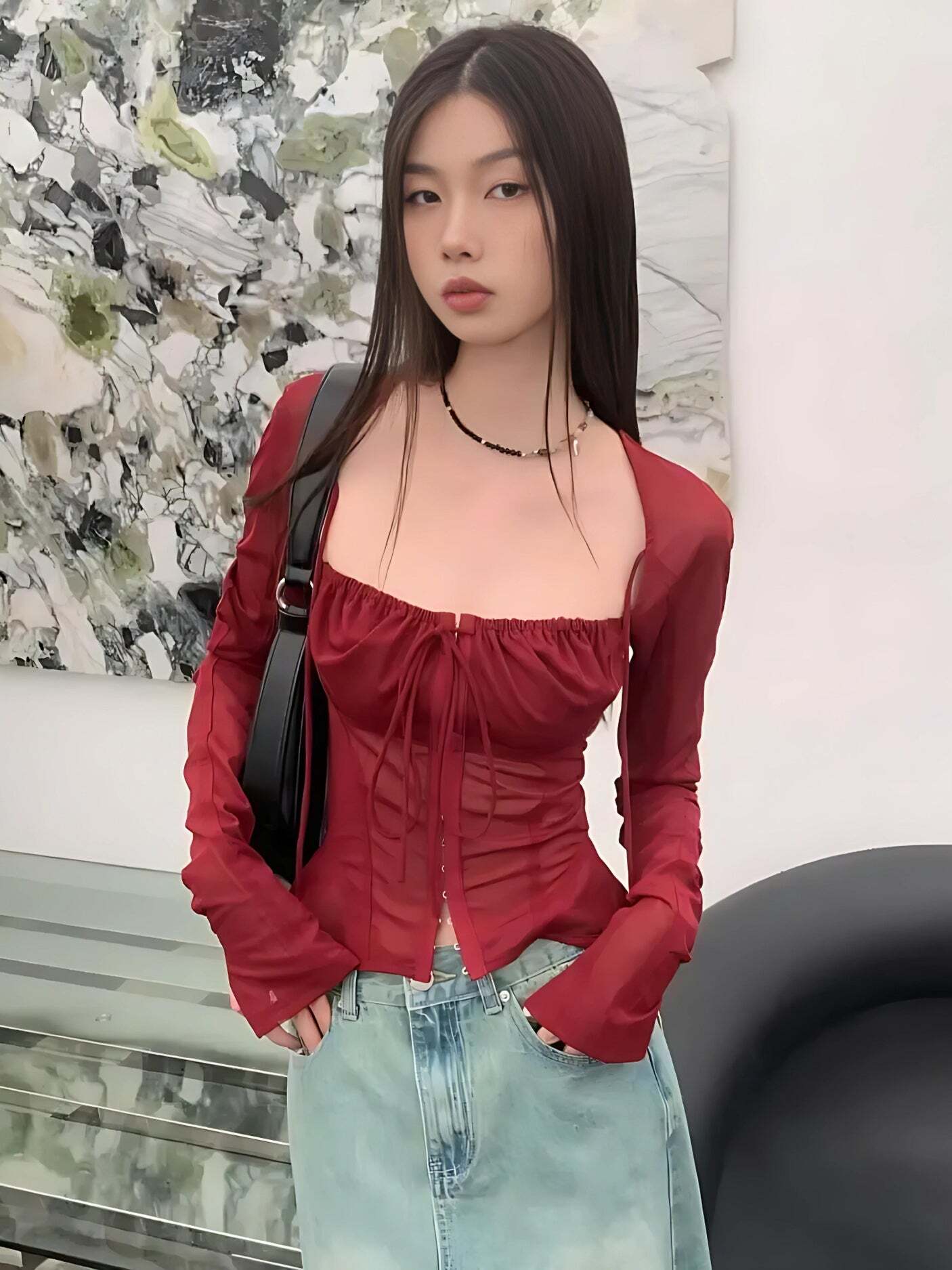 Infused with the allure of a bygone era, this top is a masterpiece of design with its sheer composition and delicate ruching. A lace-up detail provides a customizable fit, while the rich hue offers a captivating canvas for layered looks or statement accessories. A must-have for those who curate their wardrobe with a touch of the dramatic.