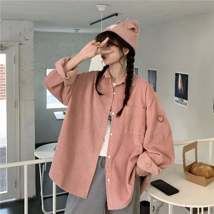 Be the first to review “Style Core Aesthetics, New Style Trends – Smiley Embroidered Corduroy Shirt” Cancel reply
