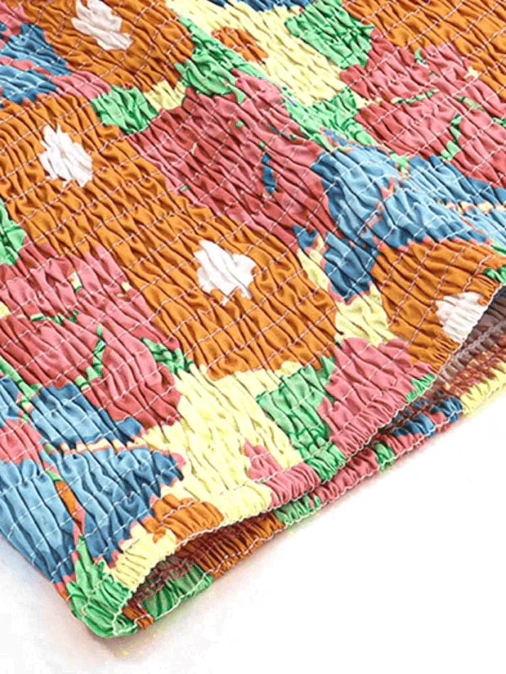 Description: Get ready to turn heads with this smocked halter crop top. Made from stretch shirred polyester fabric, it’s designed for a slightly cropped length and features a contrasting plunge halter neck. The random pattern print adds a touch of uniqueness. Embrace your personal style with this cute and trendy top.