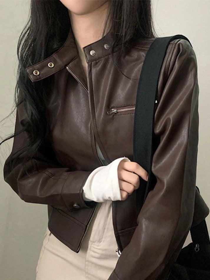 Unique Features: The jacket’s collar neck, leather design, and zipper decor give it a cool, edgy, and vintage look that stands out.