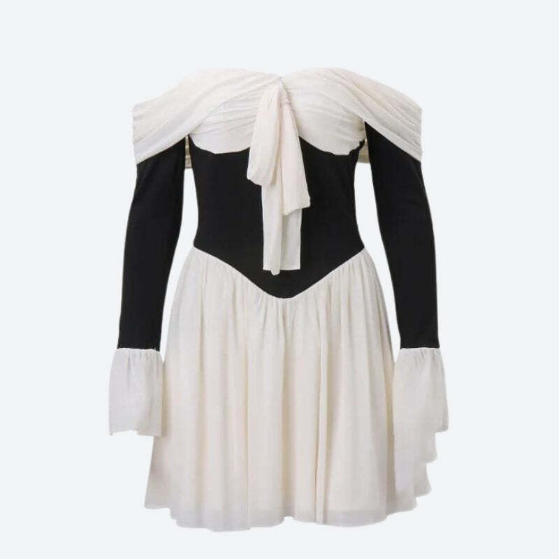 Turn heads with this elegant dress. The stunning design features a beautiful off-shoulder neckline with a delicate tie front, creating a flattering and feminine silhouette. The contrast between the black corset-style bodice and the flowing cream skirt adds a touch of sophistication and modernity, making it perfect for special occasions or a stylish night out.