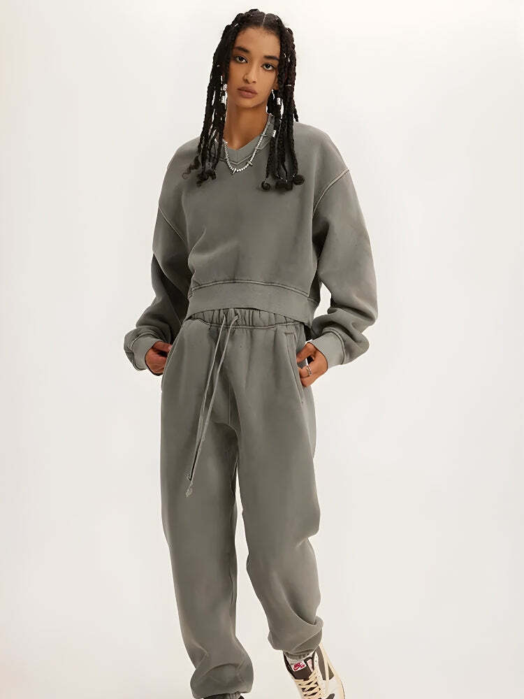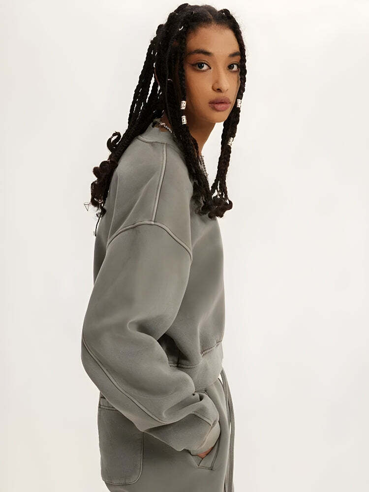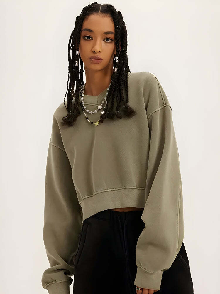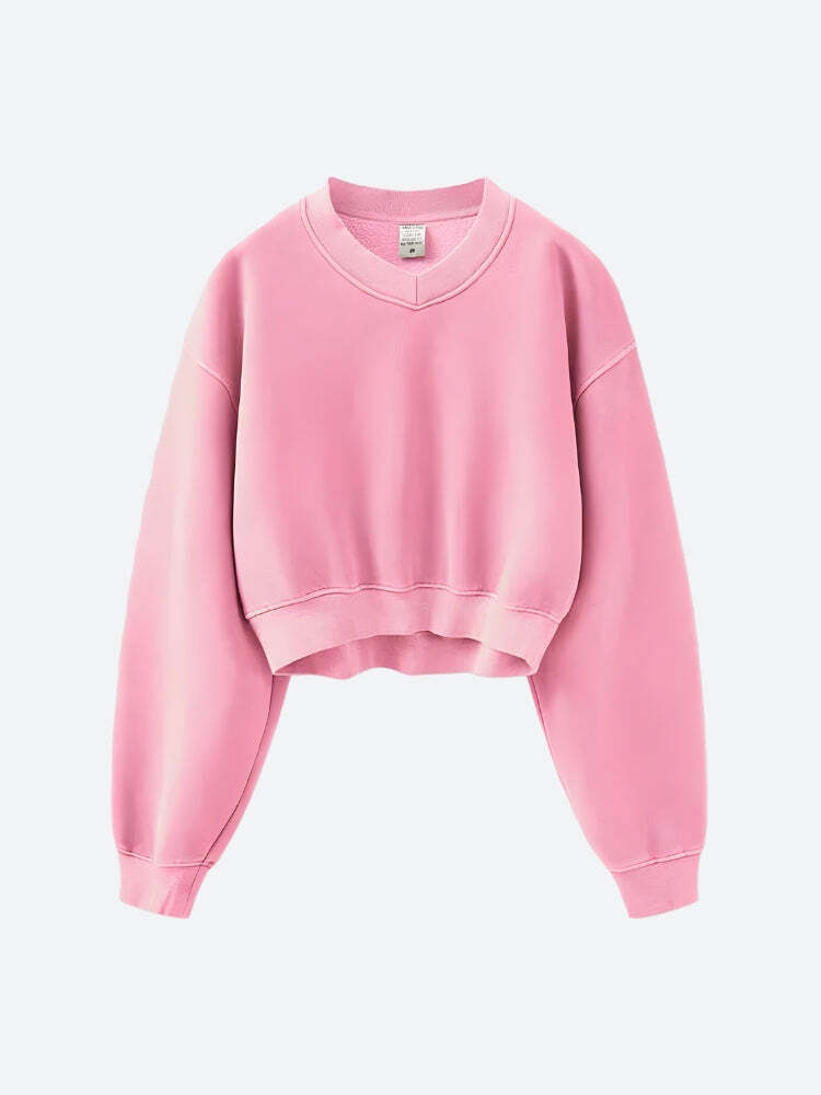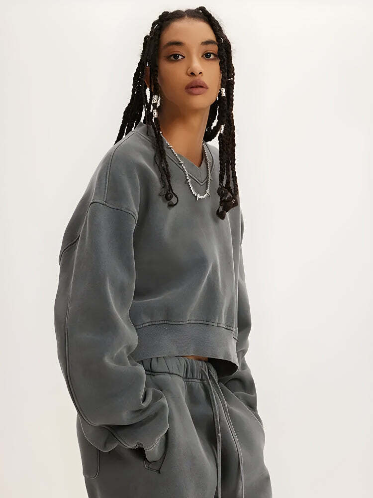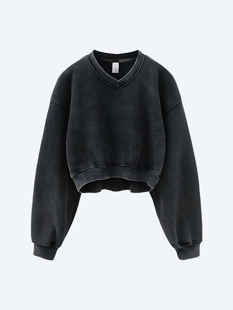 Stay cozy and chic in this cropped sweatshirt, crafted from soft material with a stylish V-neck and drop shoulders. Perfect for winter, its long sleeves and relaxed fit make it a go-to for comfy, casual, or streetwear looks.