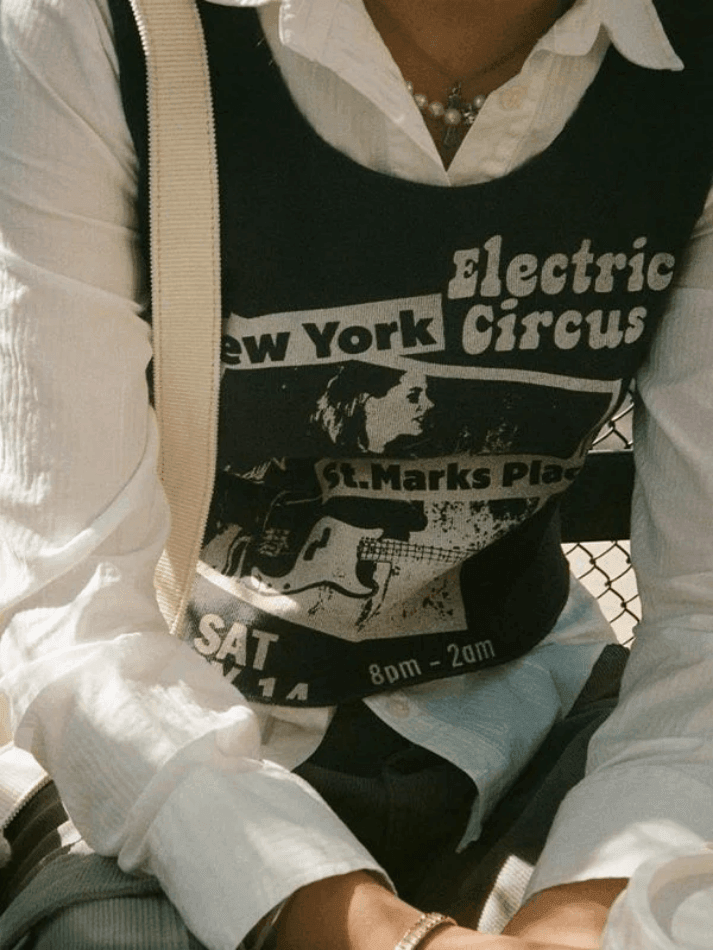 Description: Take this effortless, nostalgia tank top for chic street vibes. It’s made from stretchy cotton blend fabric, features guitar girl pattern print on the front, and has cut off hem design, ended with overlocking seam detail.