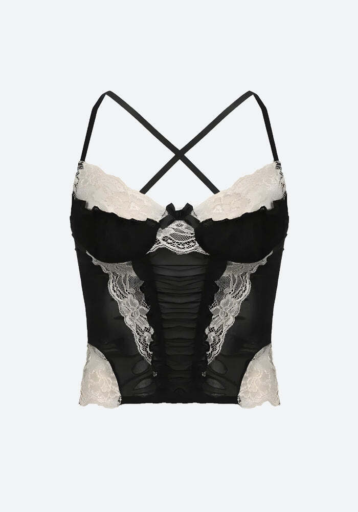 Revitalize your evening attire with the Y2K Lace Sheer Top, crafted from a diaphanous mesh adorned with elegant lace patterns and a distinctive bow detail. This piece, framed by dainty straps, captures the essence of Y2K fashion, offering a chic and cool addition to your wardrobe for nights out or sophisticated social gatherings.